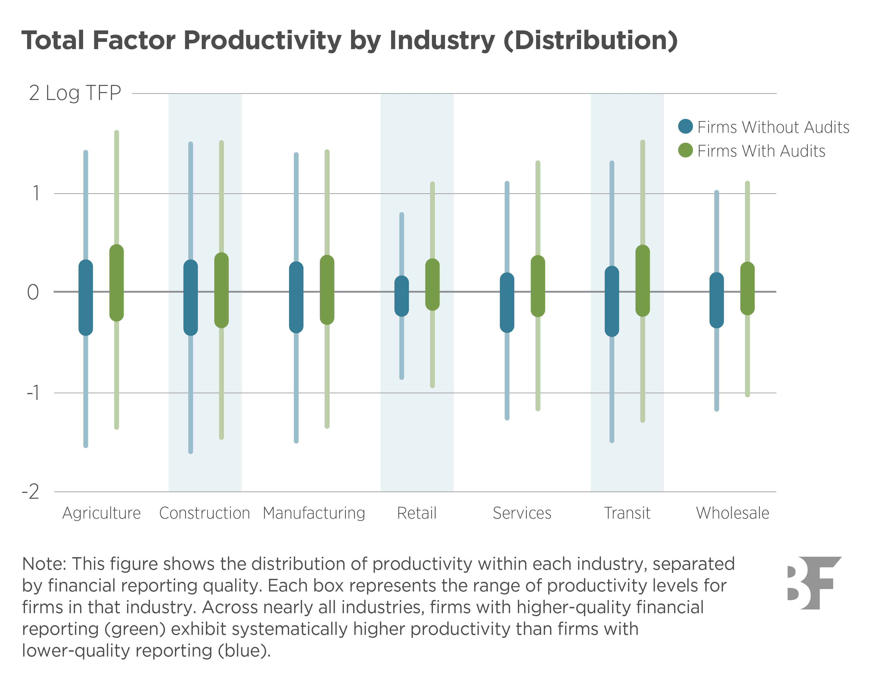 • Within the same industry, more productive firms consistently have higher-quality financial reporting standards, while less productive firms have lower-quality standards. Across all three datasets, differences in reporting quality explain 10-20% of the productivity gap between high- and low-performing firms, comparable to the explanatory power of management practices, information technology, and human capital.