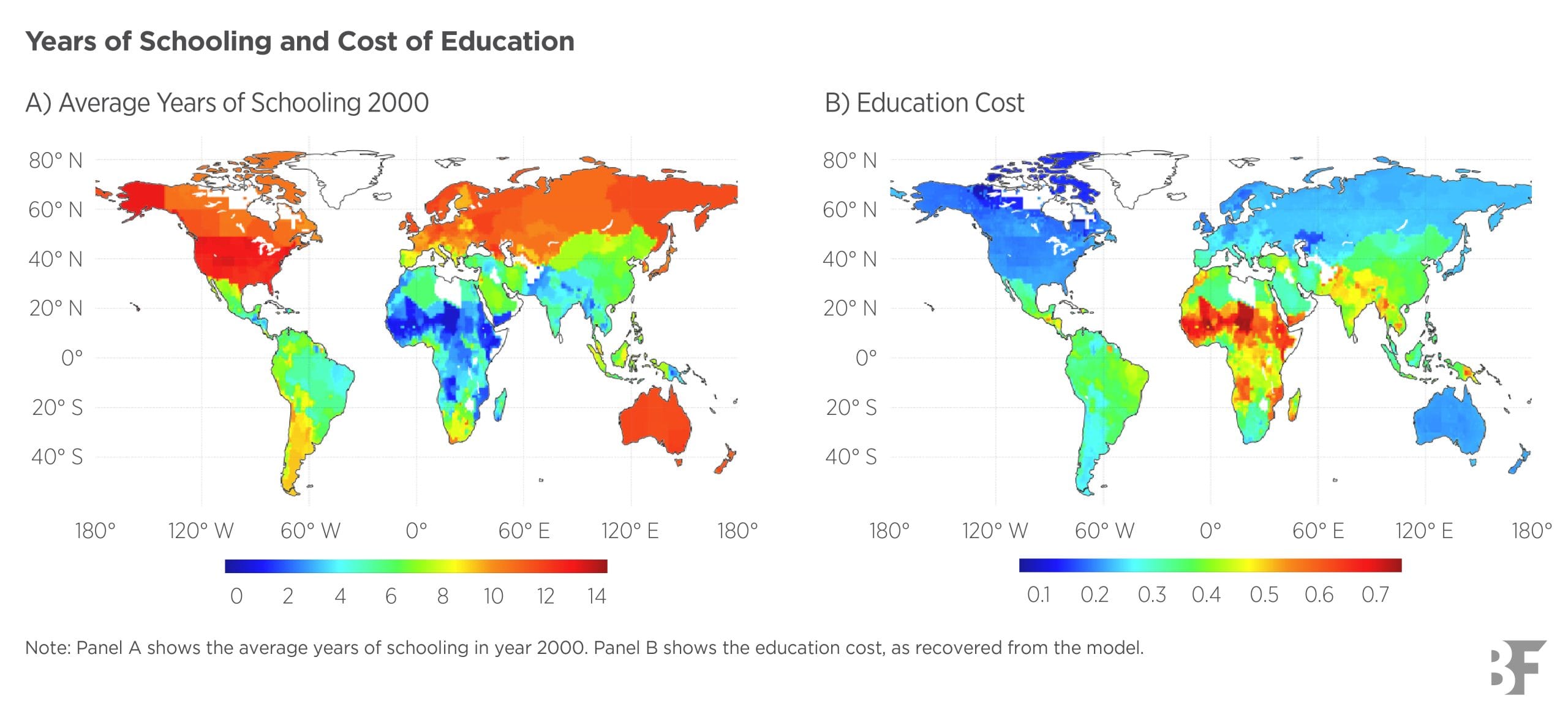 - Equalizing educational costs across space may lead to unintended consequences. As an alternative policy, the authors consider setting the cost of education to the same level across all grid cells within a region, such as sub-Saharan Africa—eliminating the variation in education costs between locations. Because schooling costs are higher in less developed areas within the region, equalizing costs lowers them more dramatically in those areas.